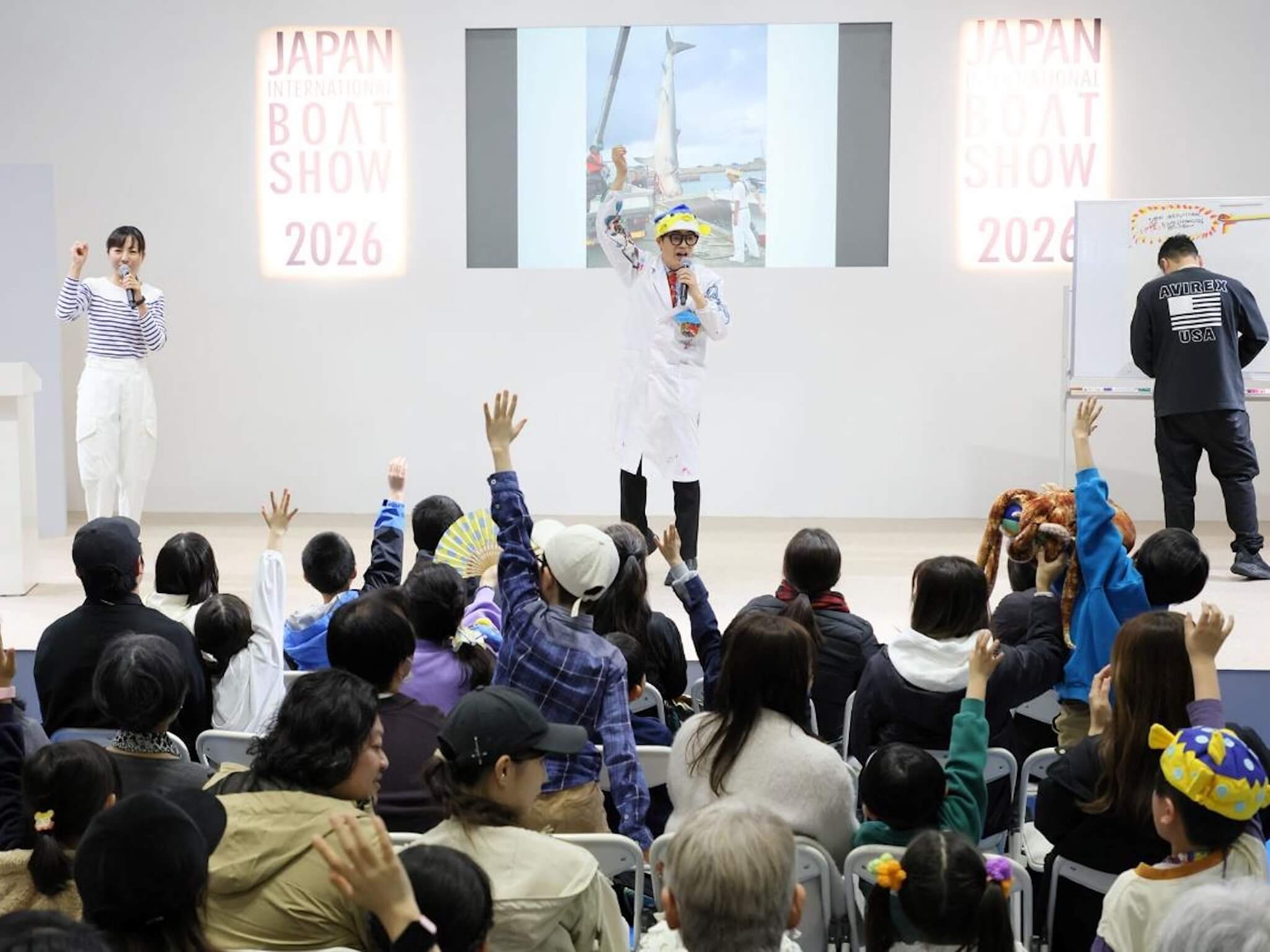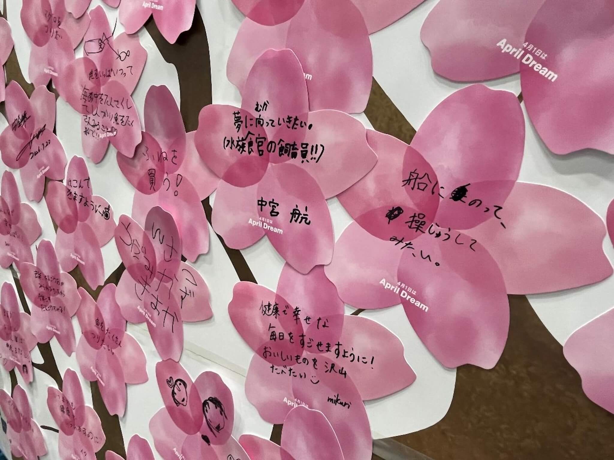 今年は例年以上に家族連れや子どもの姿が目立ち、子ども向けのイベントも充実していました。さかなクンが登壇したスペシャルステージ「ギョギョッとおさかな教室」には多くの子どもたちが集まり、イラストを描きながらの魚の解説に熱心に耳を傾けました。また、自分で描いた船を特別な機械に乗せてスクリーンの大型画面の中に映し出す「おえかきマイボート」や、桜の花びらを模したカードに夢を書いて貼り付けるメッセージボードなども用意され、会場のあちこちで子どもたちの笑顔が見られました。
