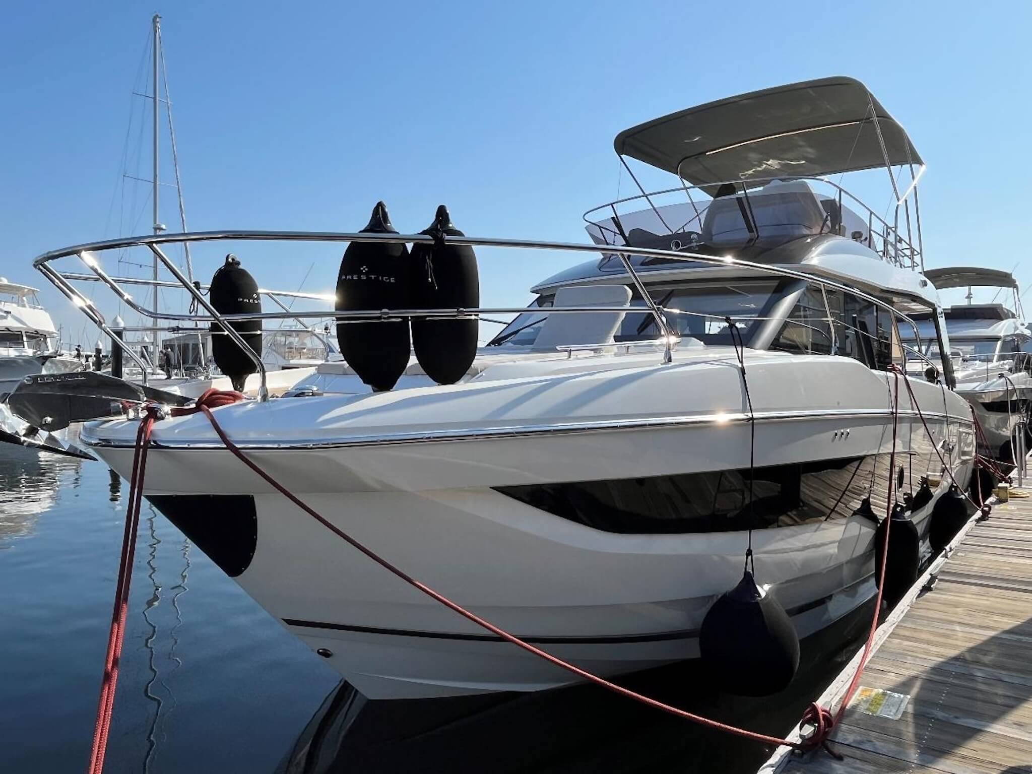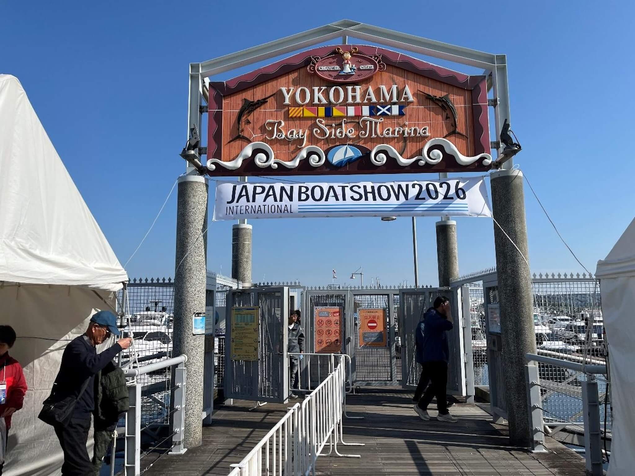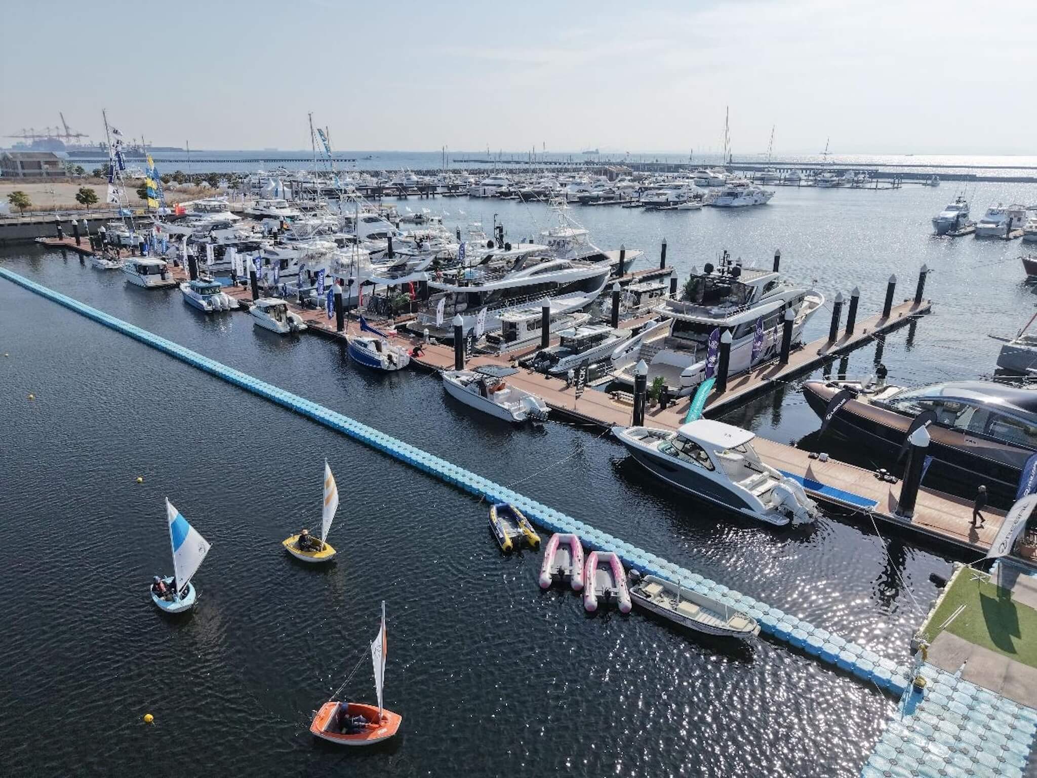 横浜ベイサイドマリーナでは、全長10メートル以上の大型艇やヨットが多数係留されています。実際の海上で、自然光の下に浮かぶ船体のスケール感を直接確認できる点が、この会場の醍醐味です。