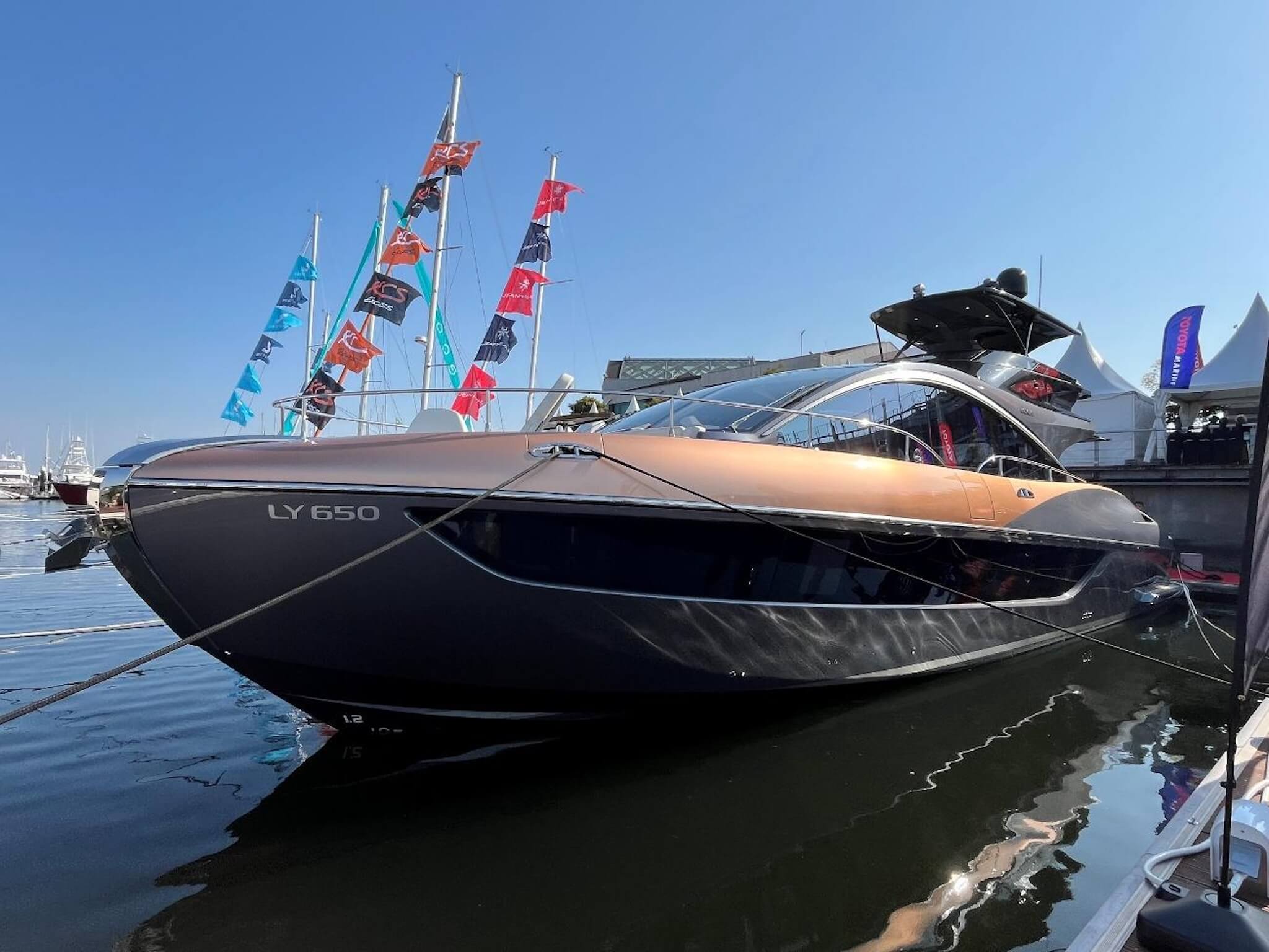 2つ目は、レクサスブランドのラグジュアリーヨット「LY650」です。全長約65フィートの船体には、同ブランドのデザイン哲学が注がれています。クーペのように流れるルーフラインと美しい2トーンカラーの外観が目を引き、船内は日本のおもてなし思想を取り入れた上質な空間に仕上がっています。居住エリアには専用のシャワールームを備えた3つのベッドルームが配置されているほか、船体の一部には軽くて丈夫な炭素繊維素材が採用されており、高い航行性能と静粛性も確保されています。