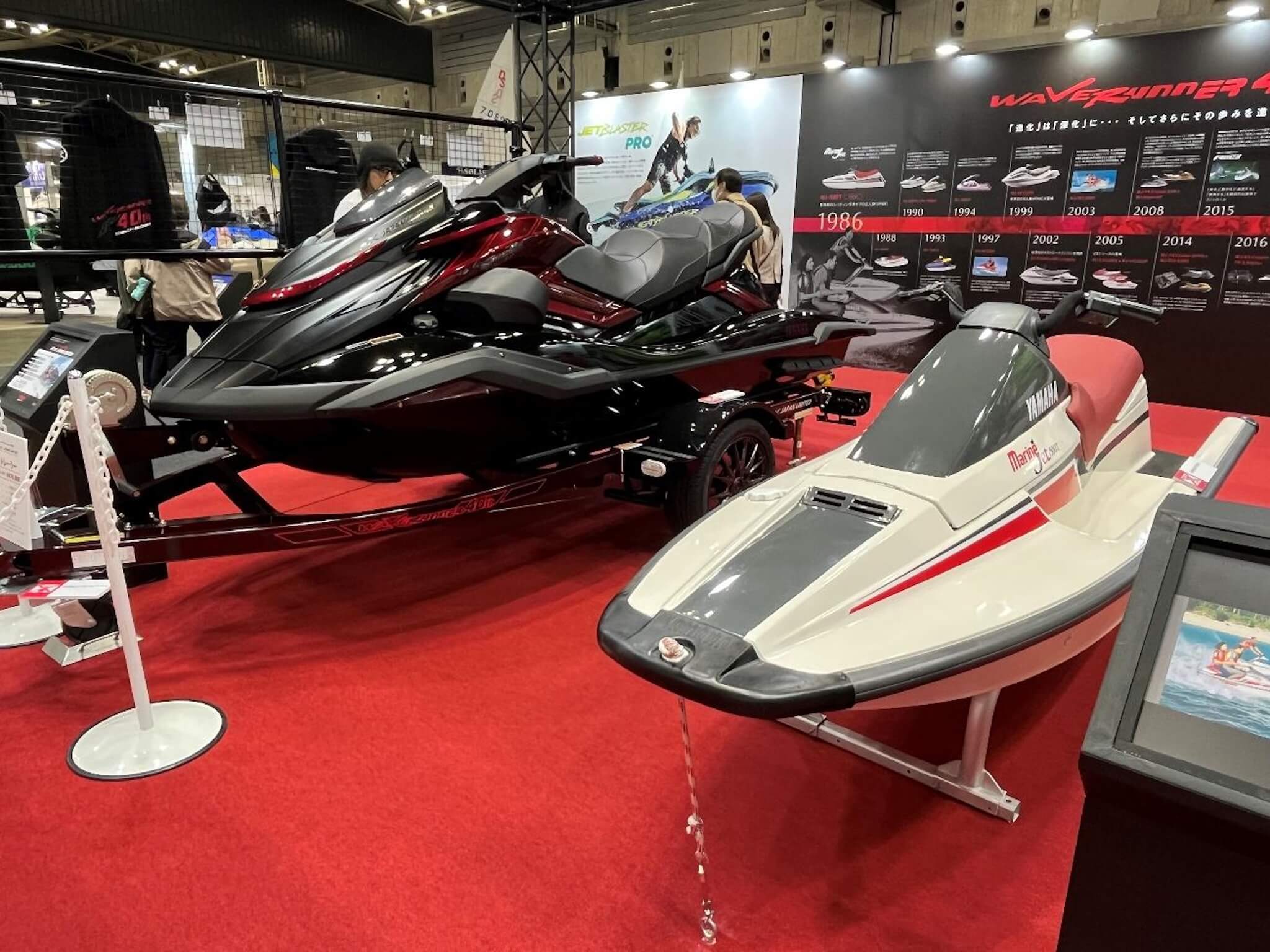 ヤマハのブースでは、水上オートバイ「WaveRunner」発売40周年を記念する展示が行われていました。1986年の初代モデル誕生から40年を迎えたことを記念し、赤を基調とした専用グラフィックやカーボンパターンを採用した日本限定の特別モデルが披露されました。また、これまでの進化の軌跡を振り返るパネルもあわせて展示されていました。