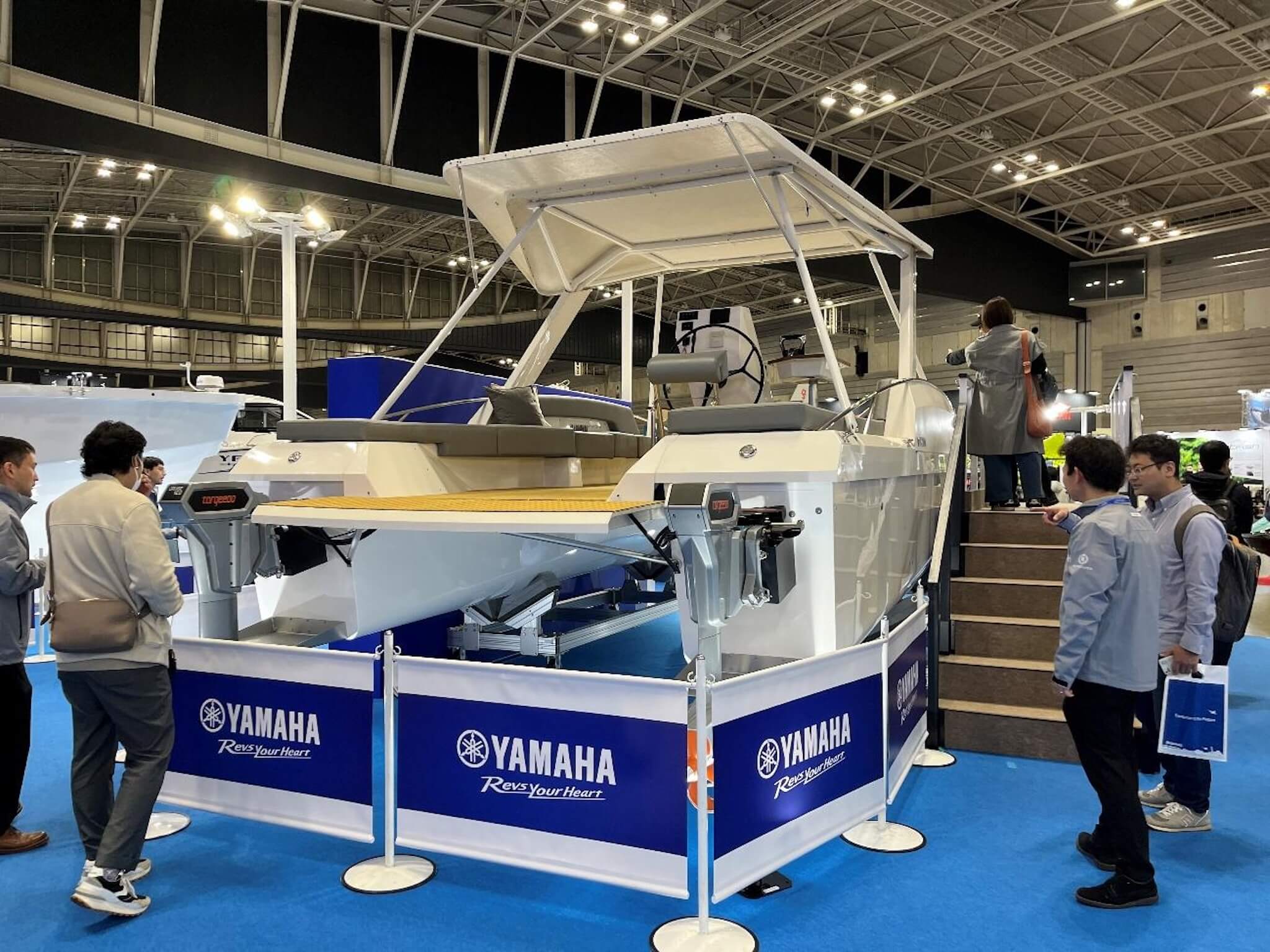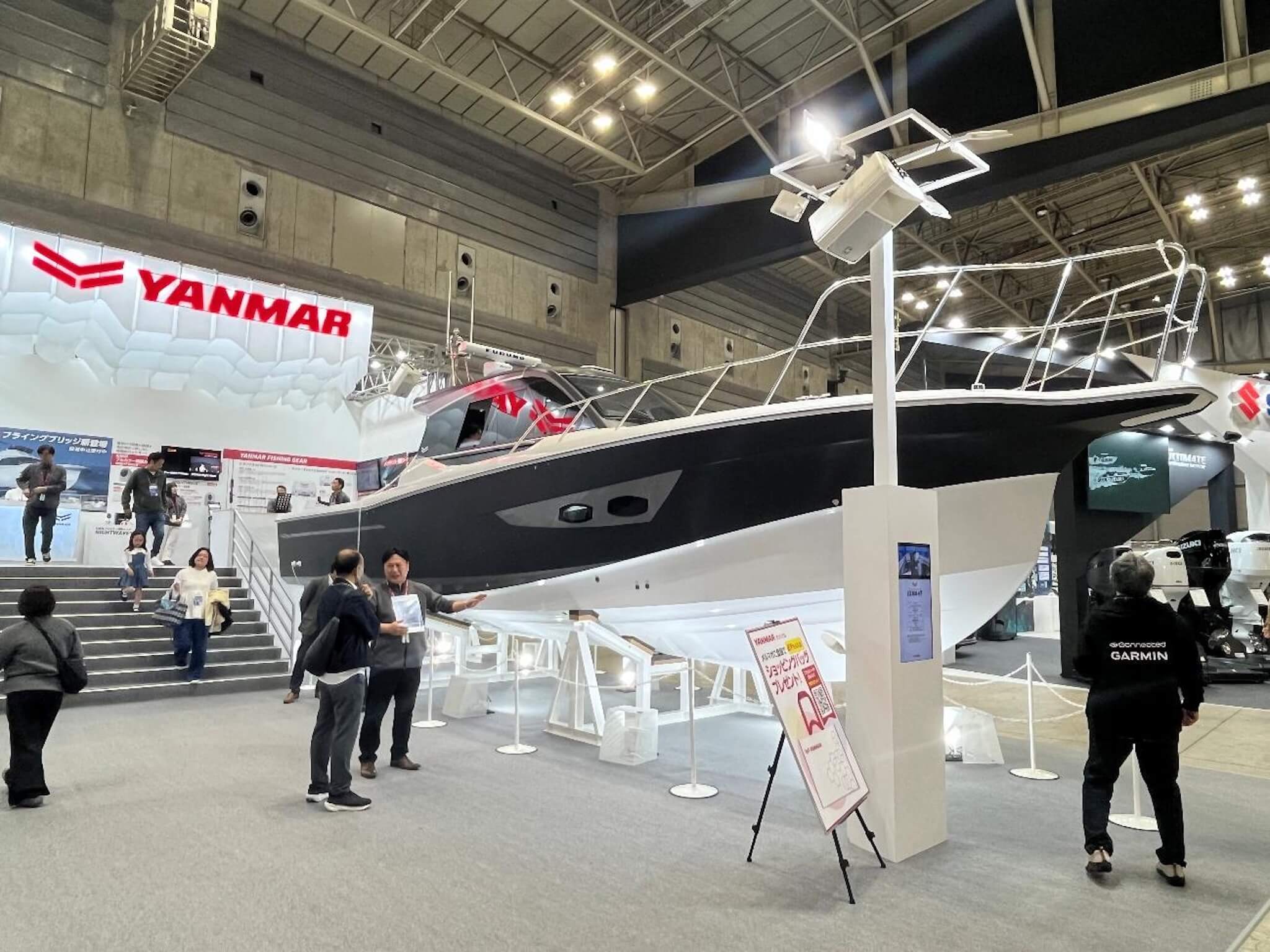 ヤンマーのブースには本格的なフィッシングクルーザーが並びました。写真の「EX38-HT」はハードトップ仕様の38フィート艇で、高出力と低燃費を両立したエンジンを搭載しています。横揺れを軽減するジャイロユニットや暗視カメラなどの装備も備え、釣りやすさと快適な船内空間を両立させています。