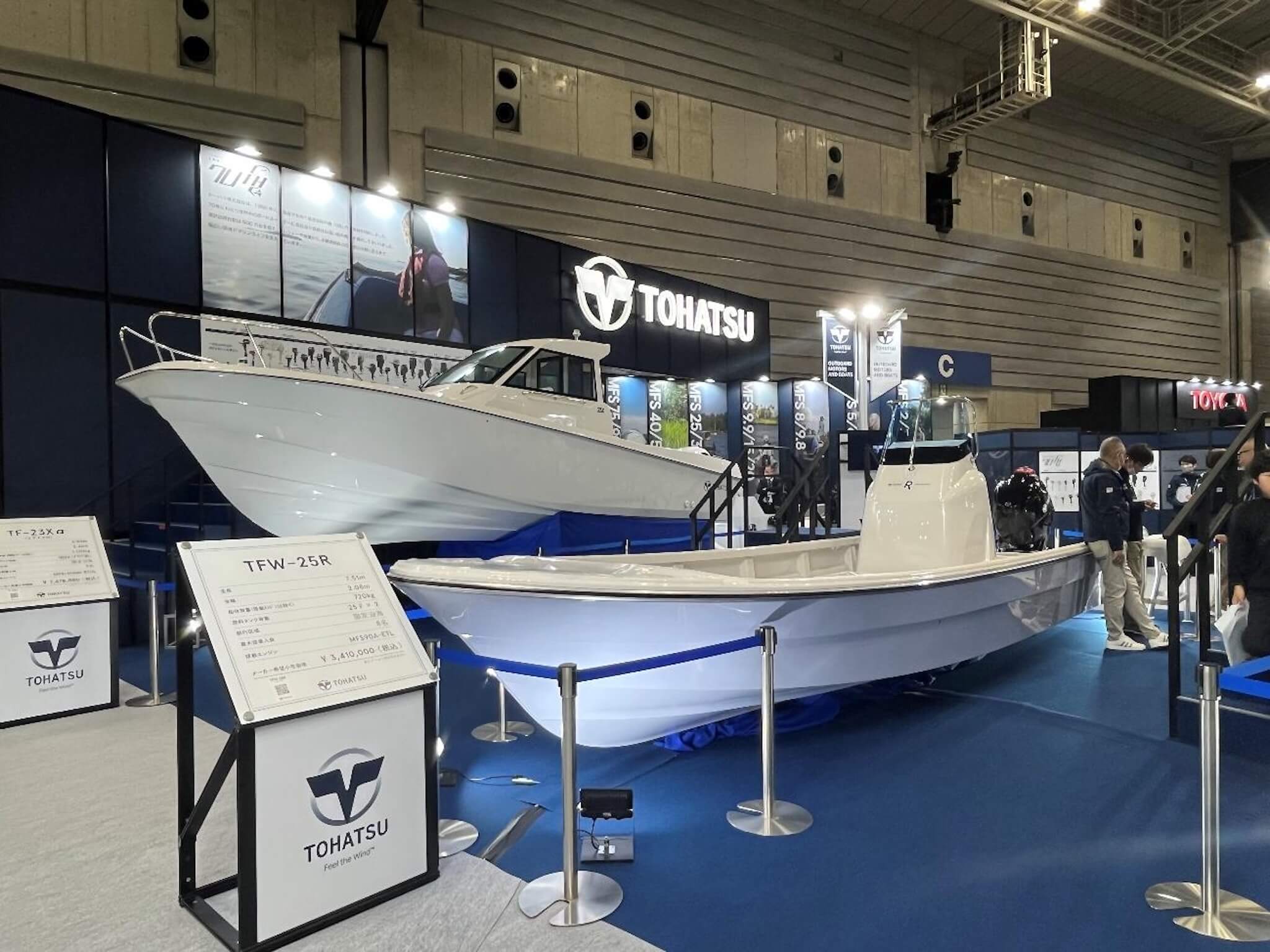 トーハツは機能的なフィッシングボート2艇を展示しました。「TF-23Xα」(写真奥)は新設計のV型船体を持ち、高い走破性と使い勝手の良さを備えたモデルです。一方の「TFW-25R」(同手前)はキャスティングに特化したフラットなデッキ形状が特徴です。どちらも釣り人の実践的なニーズに応える設計となっています。