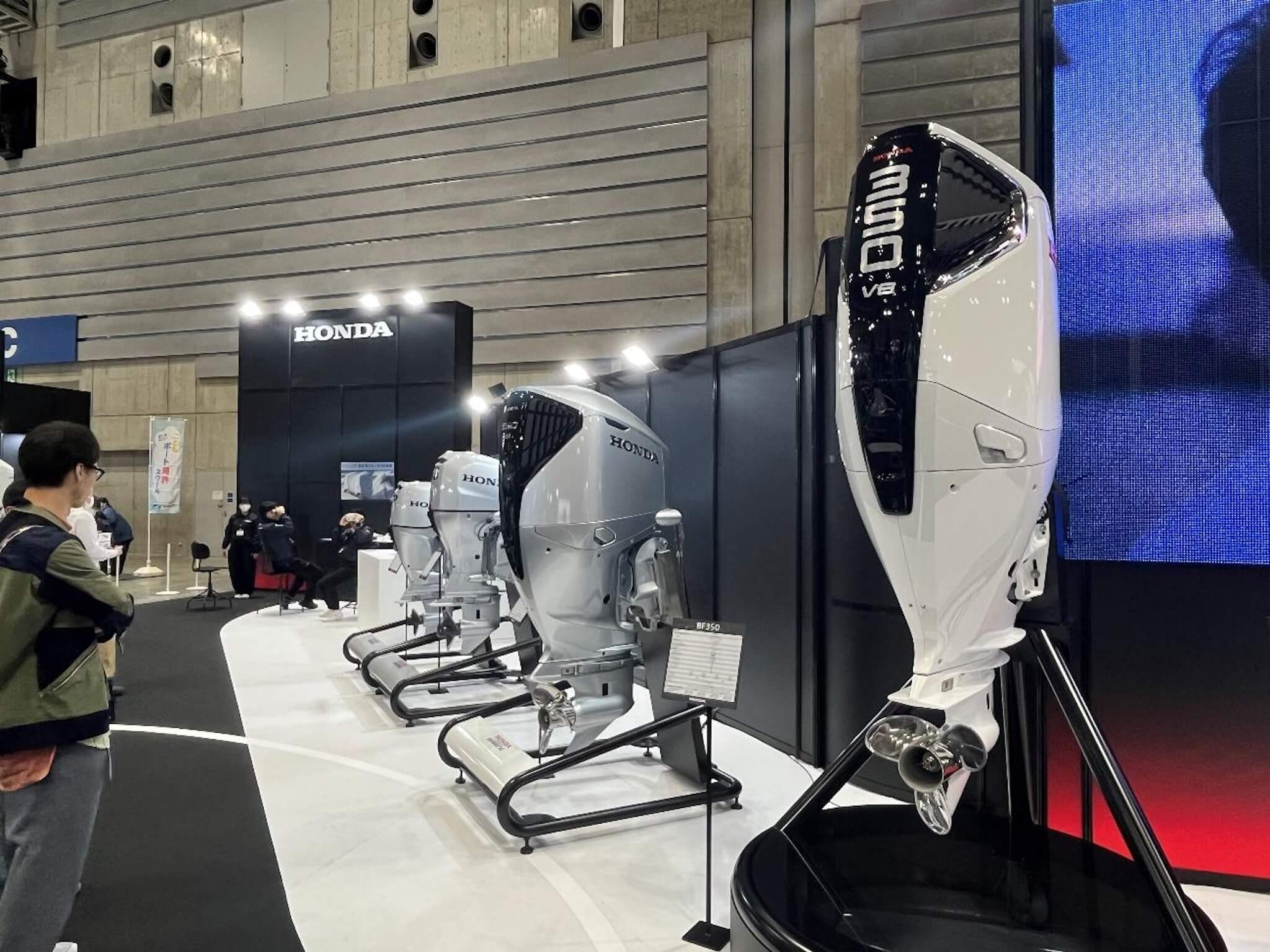 船を動かすエンジンの展示も迫力があります。ホンダのブースには、同社の船外機で最大出力となる350馬力のV型8気筒エンジン「BF350」が並びました。洗練された流線型のデザインと、圧倒的な存在感を放つ大型の船外機を間近で観察できるのもボートショーならではの体験です。